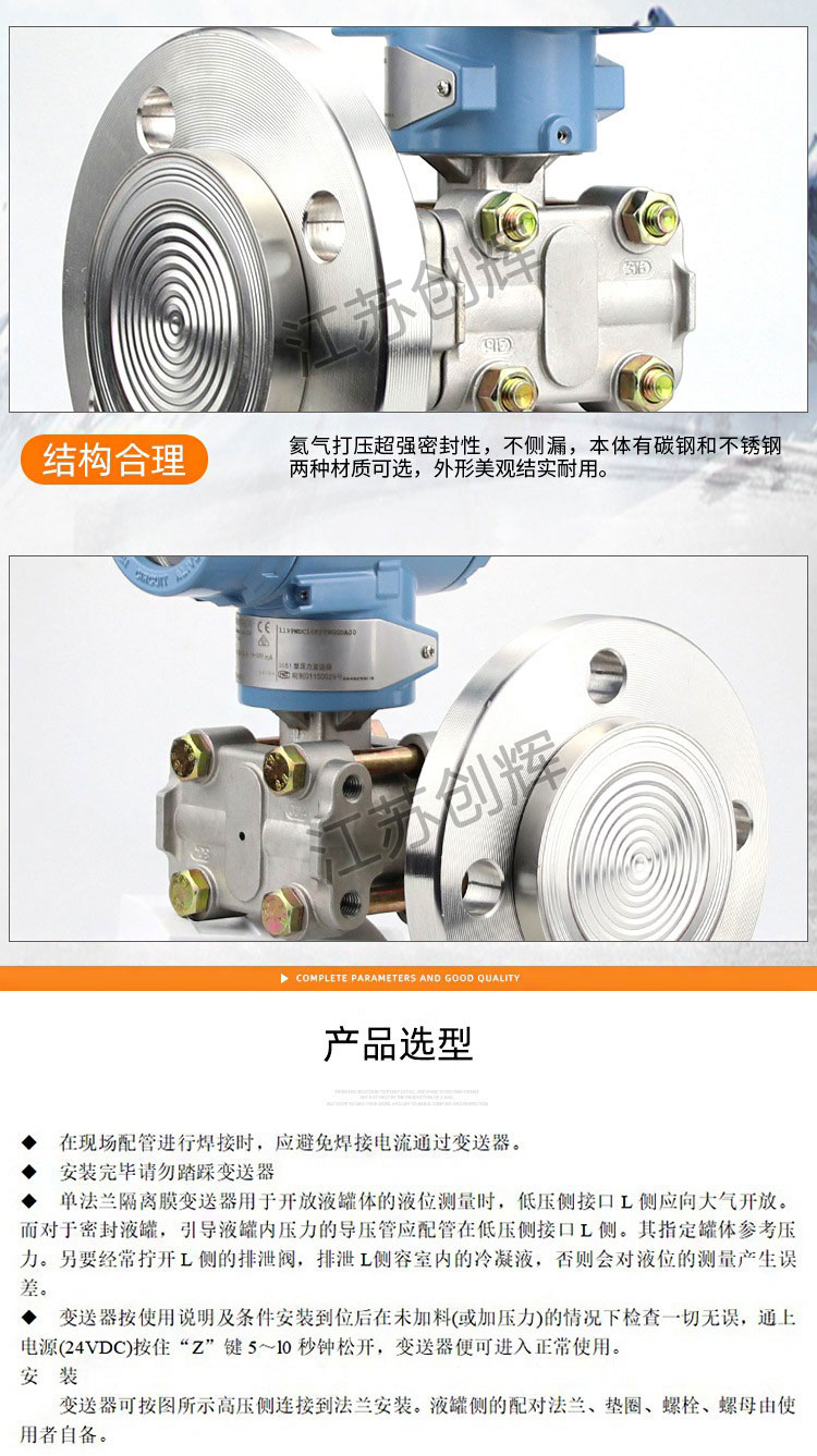 單法蘭差壓變送器采用全密封焊接結構 外形結構多樣化、采用耐高溫電路板 傳感器抗干擾強、長期穩定性好、防雷擊、防射頻干擾、高精度、高穩定性、316不銹鋼隔離膜片結構(或者鉭膜片)、多種量程選擇、用戶方便調試。