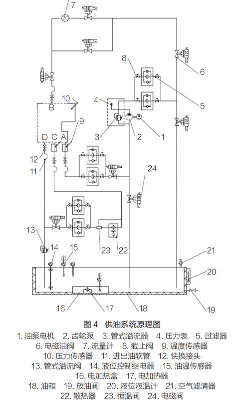 試驗(yàn)臺供油系統(tǒng)用于提供變速器試驗(yàn)所需的油壓和流量,保證油溫處于變速器的正常工作范圍內(nèi)。供油系統(tǒng)原理如圖 4 所示。通過計(jì)算機(jī)控制系統(tǒng)控制,可實(shí)現(xiàn)變速器試驗(yàn)全過程油液循環(huán)過濾、保溫、濾清器堵塞報(bào)警等功能。