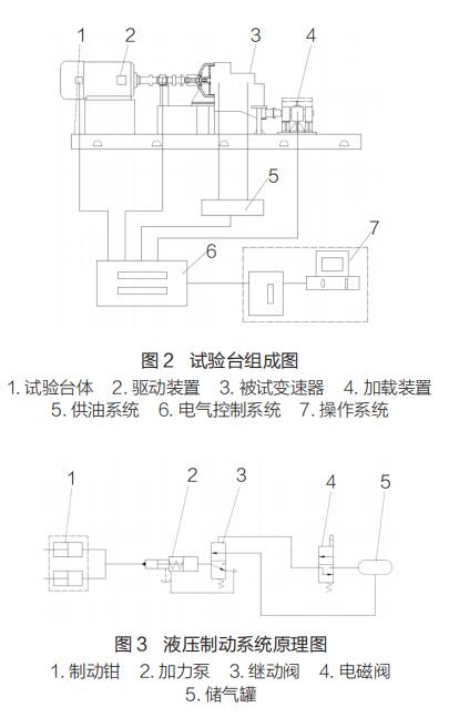 變速器超越離合器可靠性試驗(yàn)臺主要由試驗(yàn)臺體 1(試驗(yàn)平臺、驅(qū)動(dòng)電機(jī)支座、前支座、后支座)、驅(qū)動(dòng)裝置 2(驅(qū)動(dòng)電機(jī)、聯(lián)軸器)、被試變速器 3、加載裝置 4(液壓制動(dòng)系統(tǒng))、供油系統(tǒng) 5、電氣控制系統(tǒng) 6、