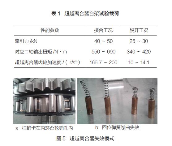 在試驗(yàn)臺上模擬渦街流量計(jì)常見工況的傳動(dòng)系載荷譜,臺架試驗(yàn) 1h 等效于整機(jī)試驗(yàn) 1.8h。利用試驗(yàn)臺進(jìn)行了 4 次累計(jì)600h 的試驗(yàn),超越離合器失效模式如圖 5 所示。超越離合器失效主要表現(xiàn)為柱銷卡死在內(nèi)環(huán)凸輪銷孔中,彈簧卷曲、斷裂,以及內(nèi)環(huán)凸輪滾道壓痕明顯,與市場反饋的失效模式基本一致。該試驗(yàn)臺對市場故障具有很好的再現(xiàn)性,極大縮短了故障驗(yàn)證時(shí)間,減少了整機(jī)試驗(yàn)時(shí)的排放和噪聲污染,具有良好的經(jīng)濟(jì)效益和社會效益。■